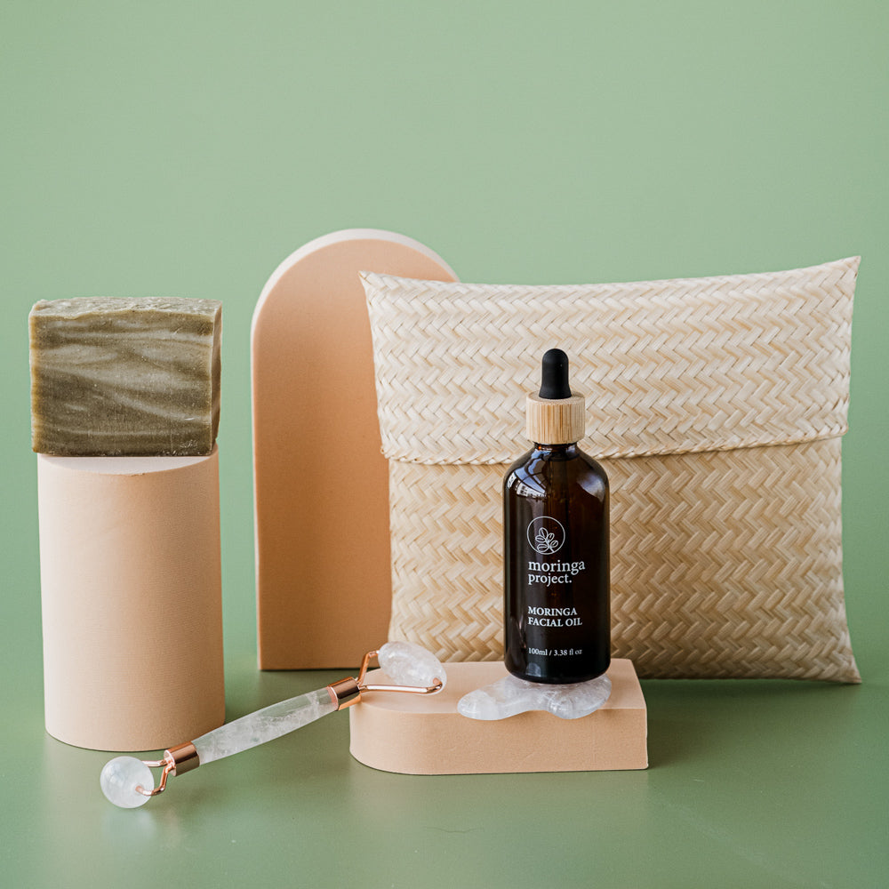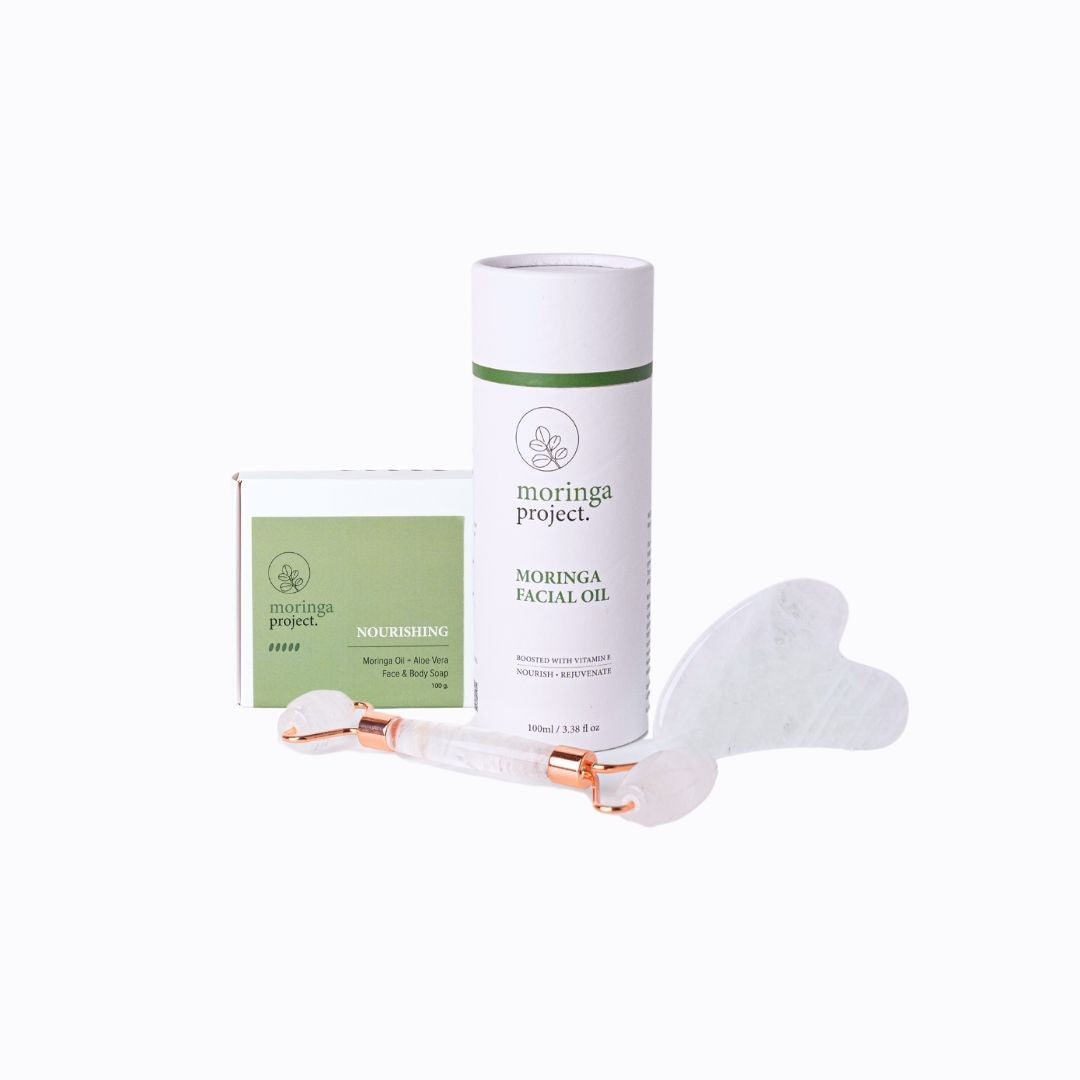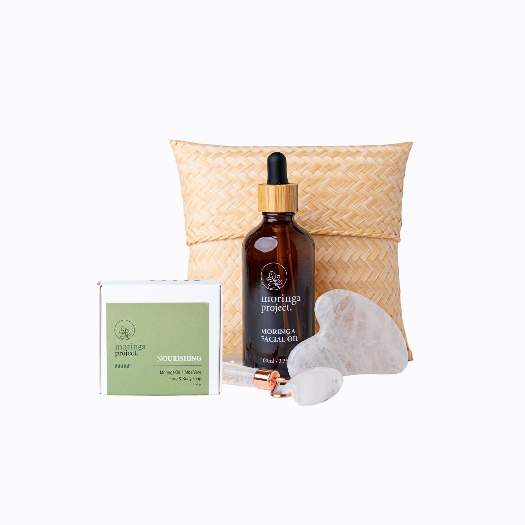 A ritual wrapped in four essentials, the Moringa Ritual Set brings together 100ml of nutrient-rich Moringa Facial Oil, two sculpting Clear Quartz tools, and a handmade Face & Body Bar of your choice—creating a full-circle skincare practice that purifies, nourishes, and restores.