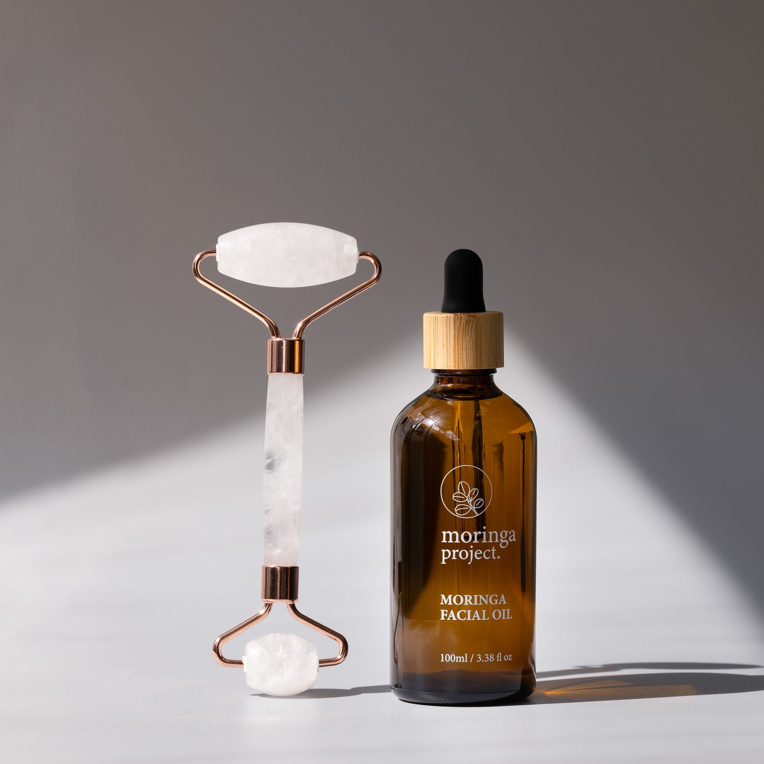 Choose between 30ml or 100ml Moringa Facial Oil, accompanied by a Gua Sha or Face Roller — whichever shape calls to you.