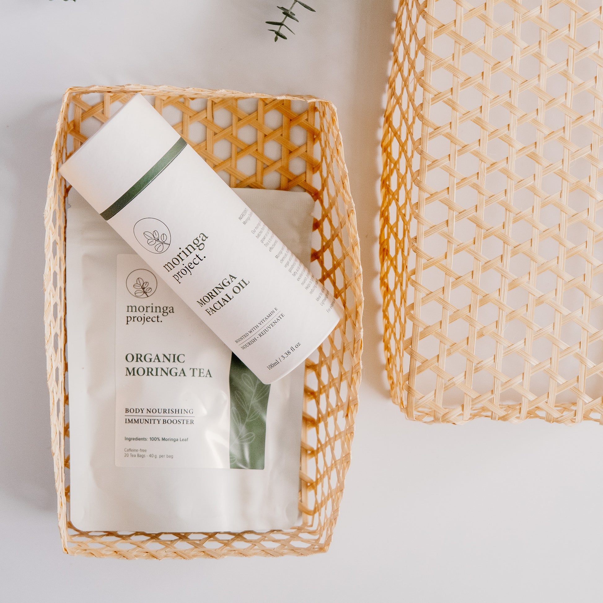 A moment of quiet, wrapped in nature’s most potent calmers. The Moringa Calming Gift Set brings together 100ml of Moringa Facial Oil and Organic Moringa Tea—a duo designed to nourish, soothe, and bring the body back to balance.